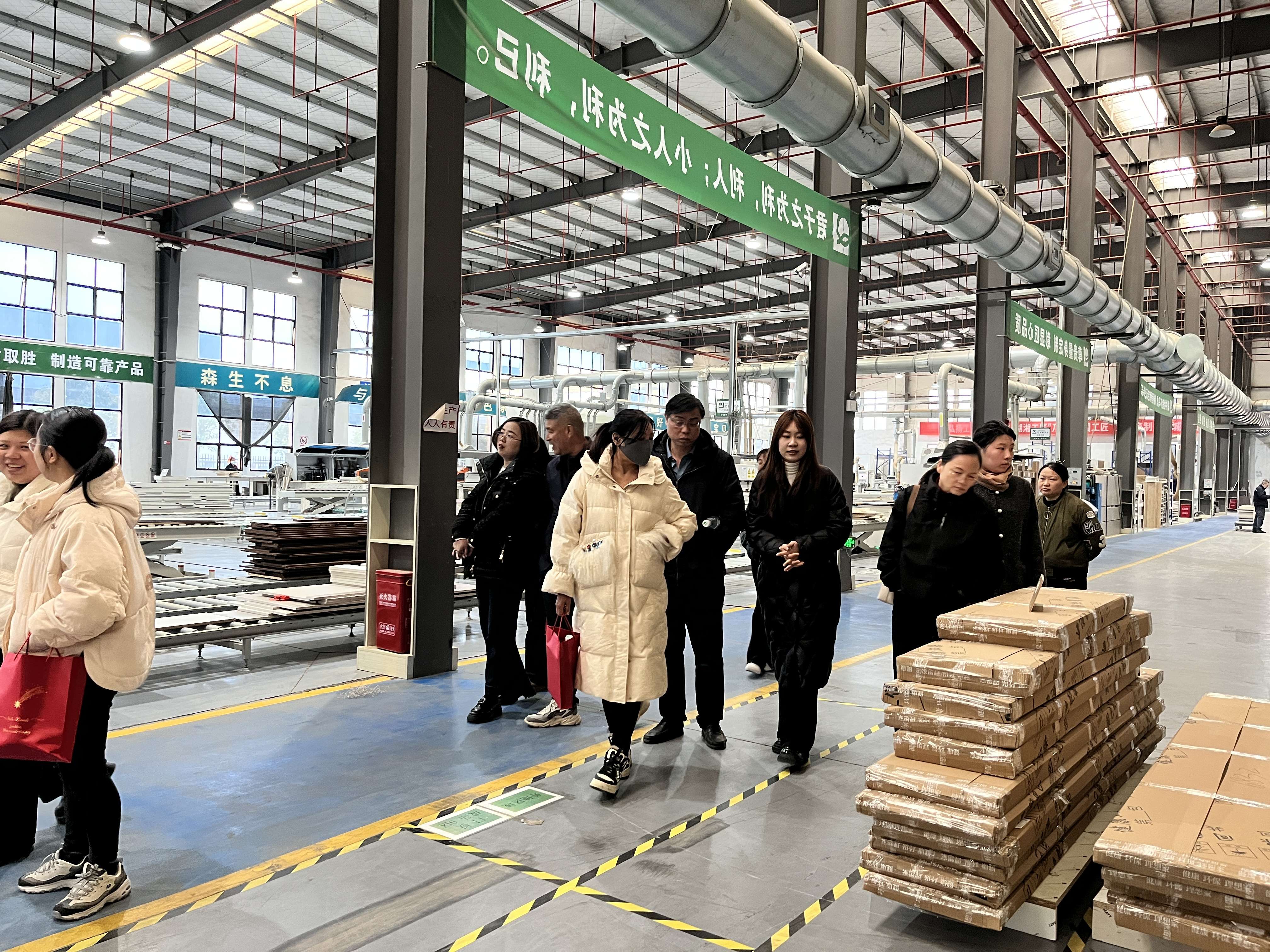 生产中心负责人蔡总随即对板材的种类及优缺点进行了讲解,带领大家对板材切割、开槽、封边、打孔、试装等环节进行了细致参观,随同人员高度认可,最后蔡总重点介绍了开料、封边、钻孔、质检、打包生产的五道工序,各环节紧密衔接,形成高效闭环。